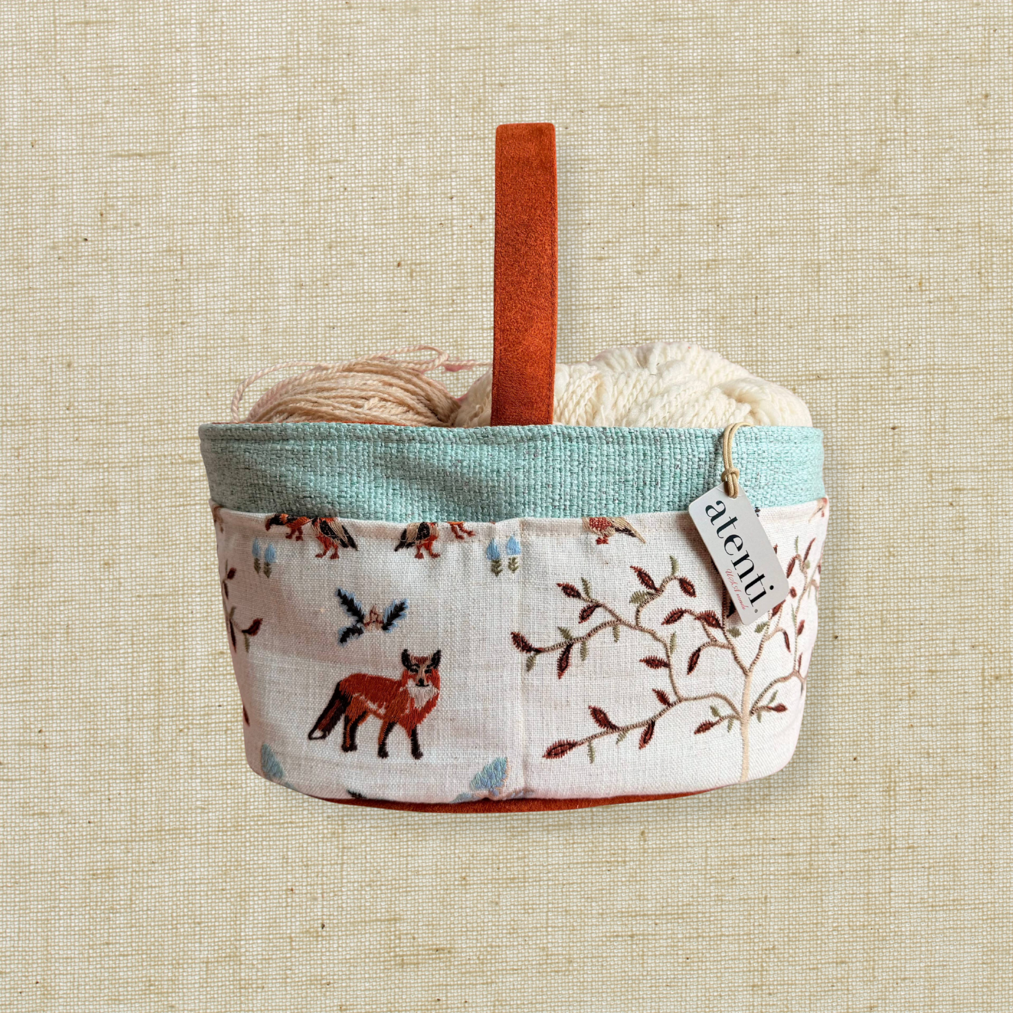 Whimsical, cozy, and full of woodland charm, the Foxy Caddy is a delightful companion for keeping your yarn, tools, and creative essentials close at hand. Featuring a toile-style cotton-linen blend woven with rustic foxes and branching trees in warm brown against an off-white background, this caddy brings a quiet forest story into your space.